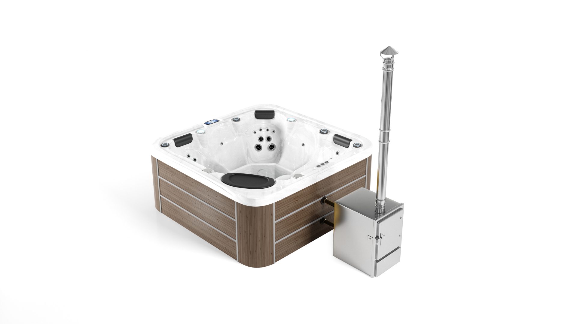 Wir waren auf der Suche nach einem Hottub, der sich mit einem Holzofen beheizen lässt, aber trotzdem alle Zusatzfunktionen eines Whirlpools bietet.