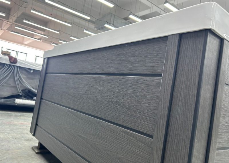 Verkleidung: Graues WPC mit Holzmaserung – modernes Finish für exklusiven Look (auf Wunsch gegen Aufpreis mit echtem Thermoholz)